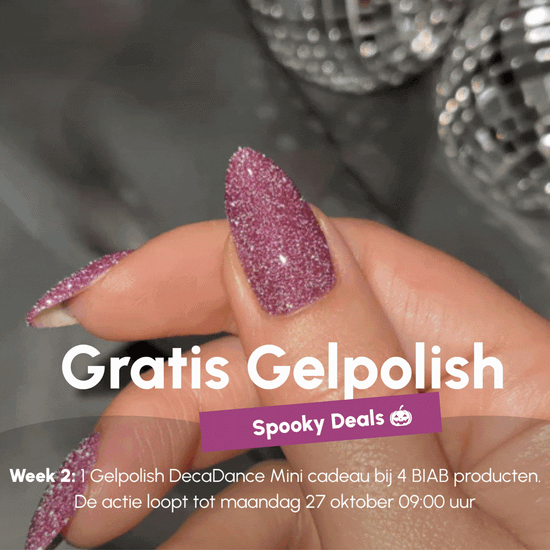 Krijg 1 gratis Gelpolish DecaDance cadeau bij aankoop van 4 BIAB™producten. Deze actie geldt t/m maandag 27 oktober 09:00 uur.